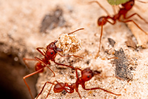 An Acromyrmex versicolor worker carries a seed to the nest to feed her fungus.